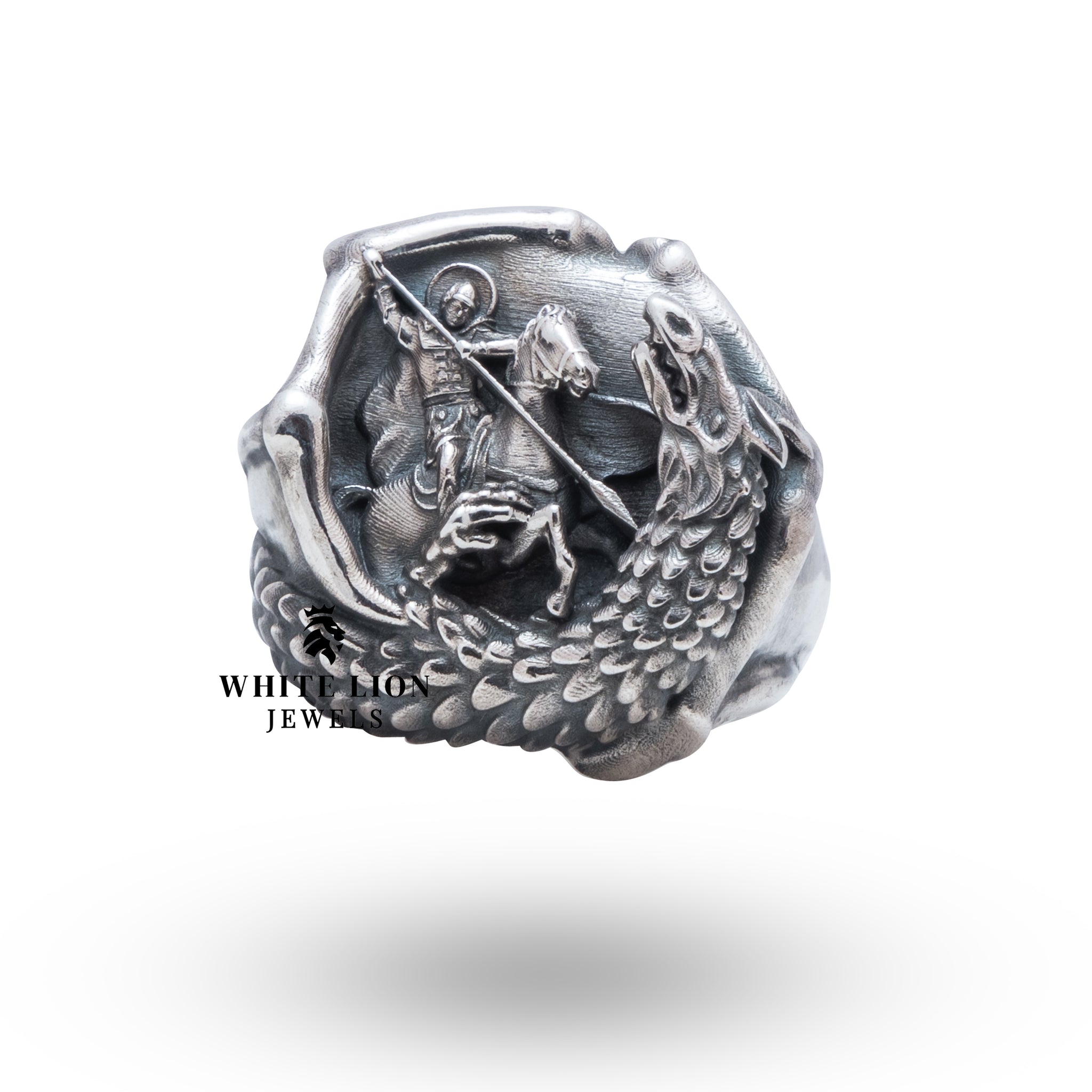 Elevate your jewelry collection with the exquisite Saint George Slaying Dragon 925 Sterling Silver Ring from White Lion Jewels (WLJ). This stunning piece embodies bold elegance, making it the perfect accessory for those who appreciate outstanding craftsmanship and unique design. Ideal for individuals seeking a distinctive statement piece that reflects their personality and story.