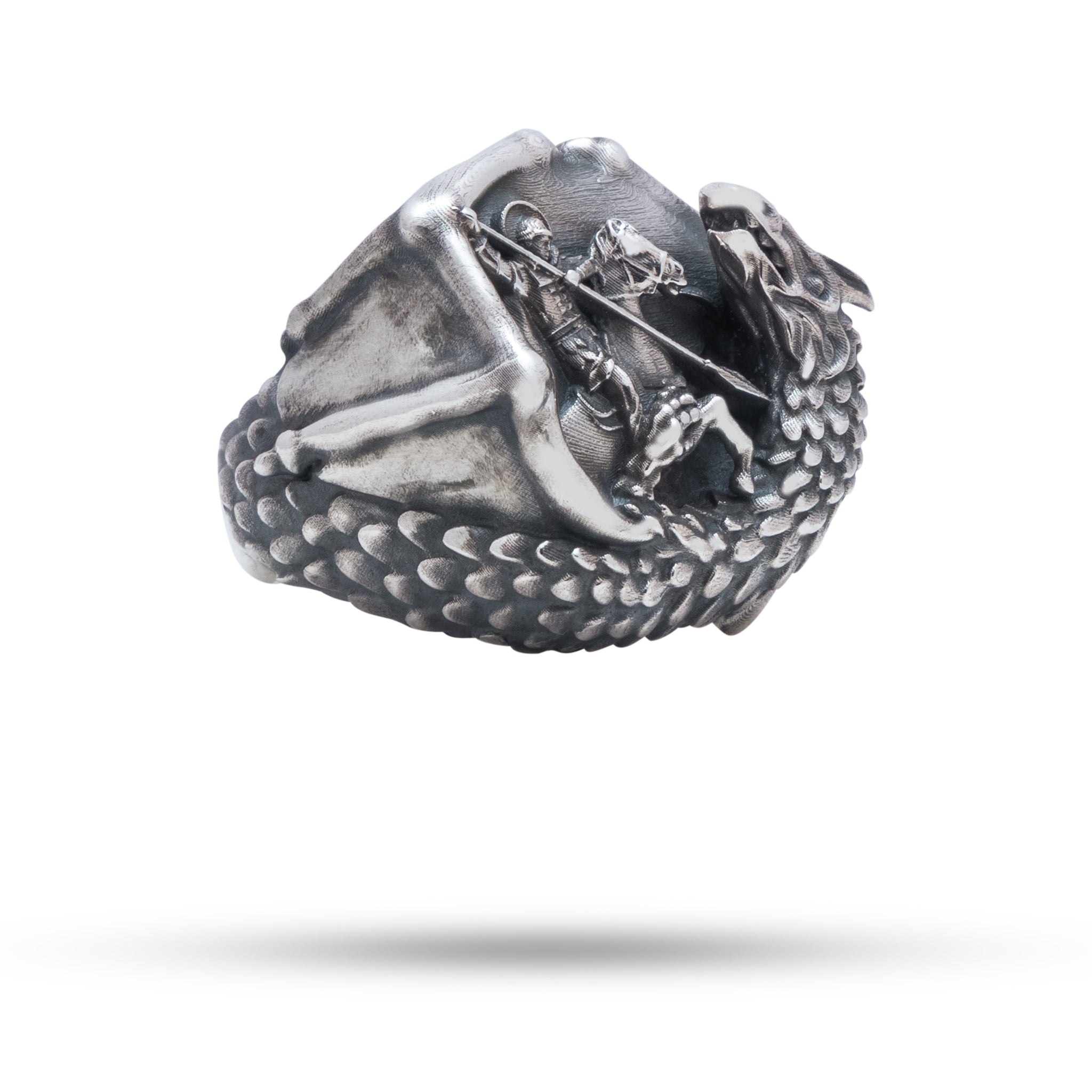 The Saint George Slaying Dragon Ring is a masterpiece of artisanal quality. Crafted from 925 sterling silver, this oxidized silver ring portrays the legendary St. George in an intricate design, encapsulating the relentless spirit of bravery and triumph. Every detail is meticulously crafted, showcasing superior finesse that highlights the brand's commitment to excellence and luxury.