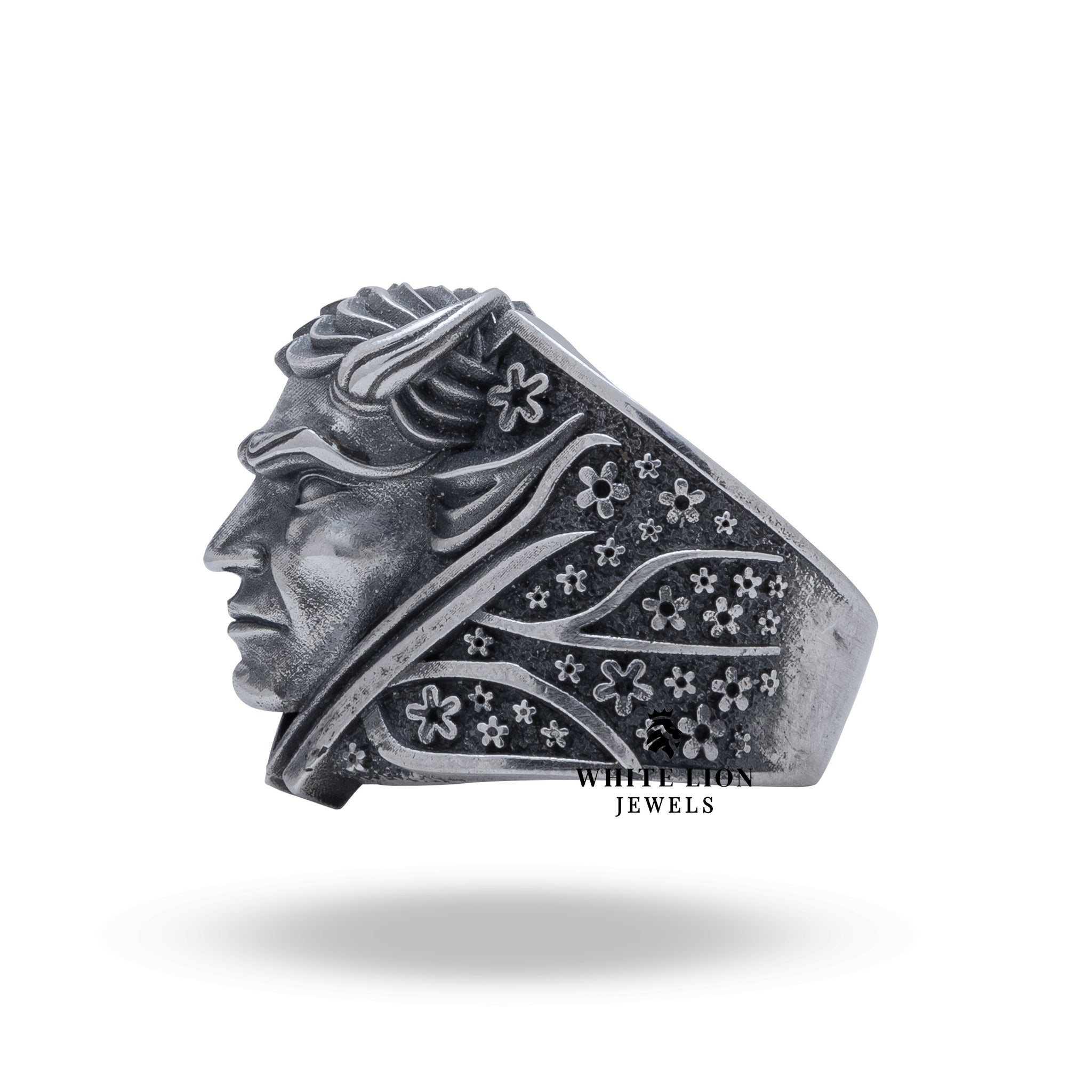 Introducing the Oni Japanese Demon Devil Evil Spirit Flowers 925 Sterling Silver Ring by White Lion Jewels. This exquisite piece marries bold artistry with cultural significance, making it the perfect accessory for those who appreciate unique and intricate jewelry. Crafted for individuals with distinct taste, this ring is not just an adornment but a conversation starter, offering elegance merged with the mystique of Japanese folklore.