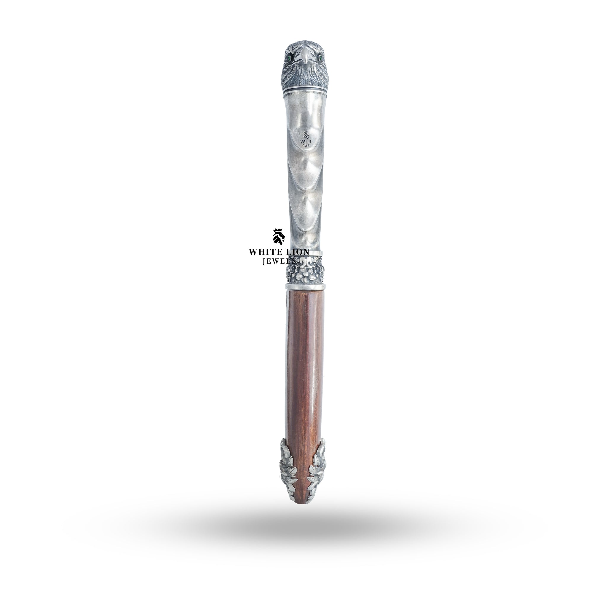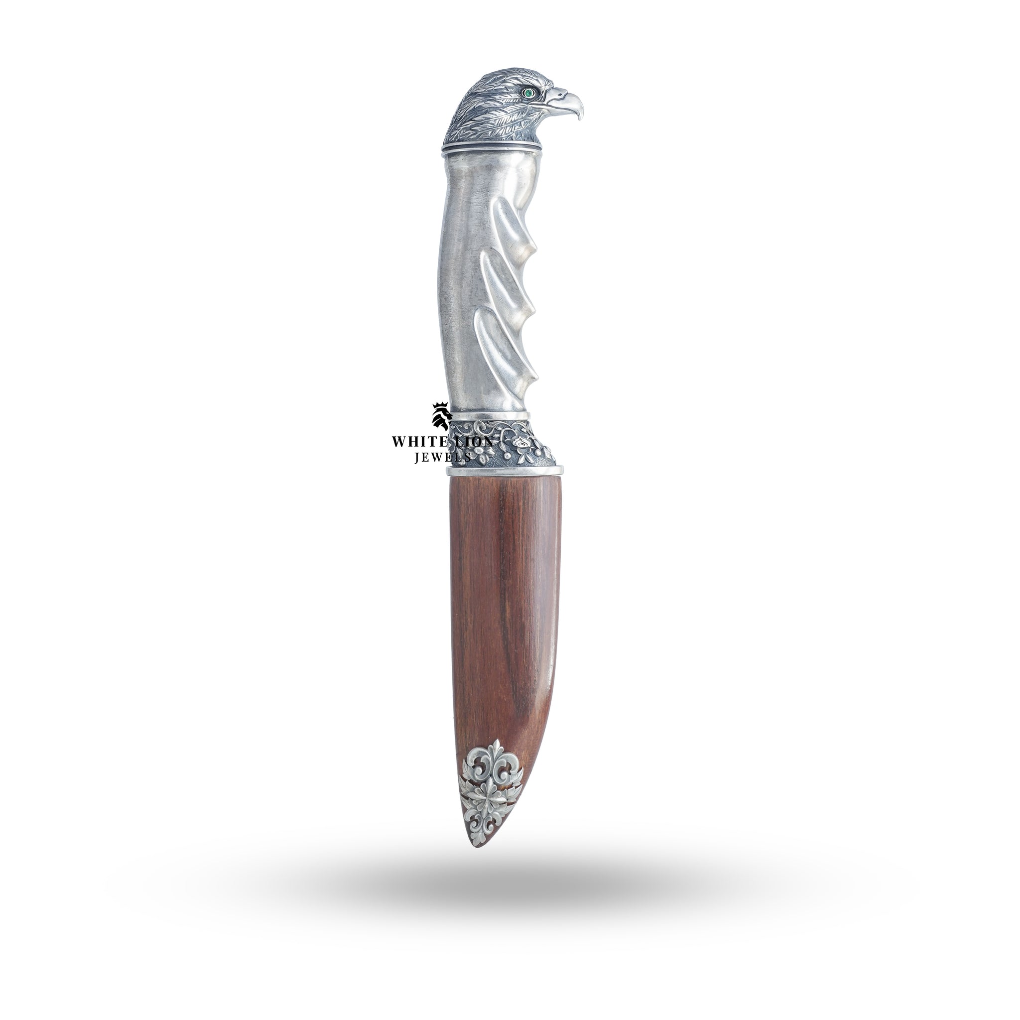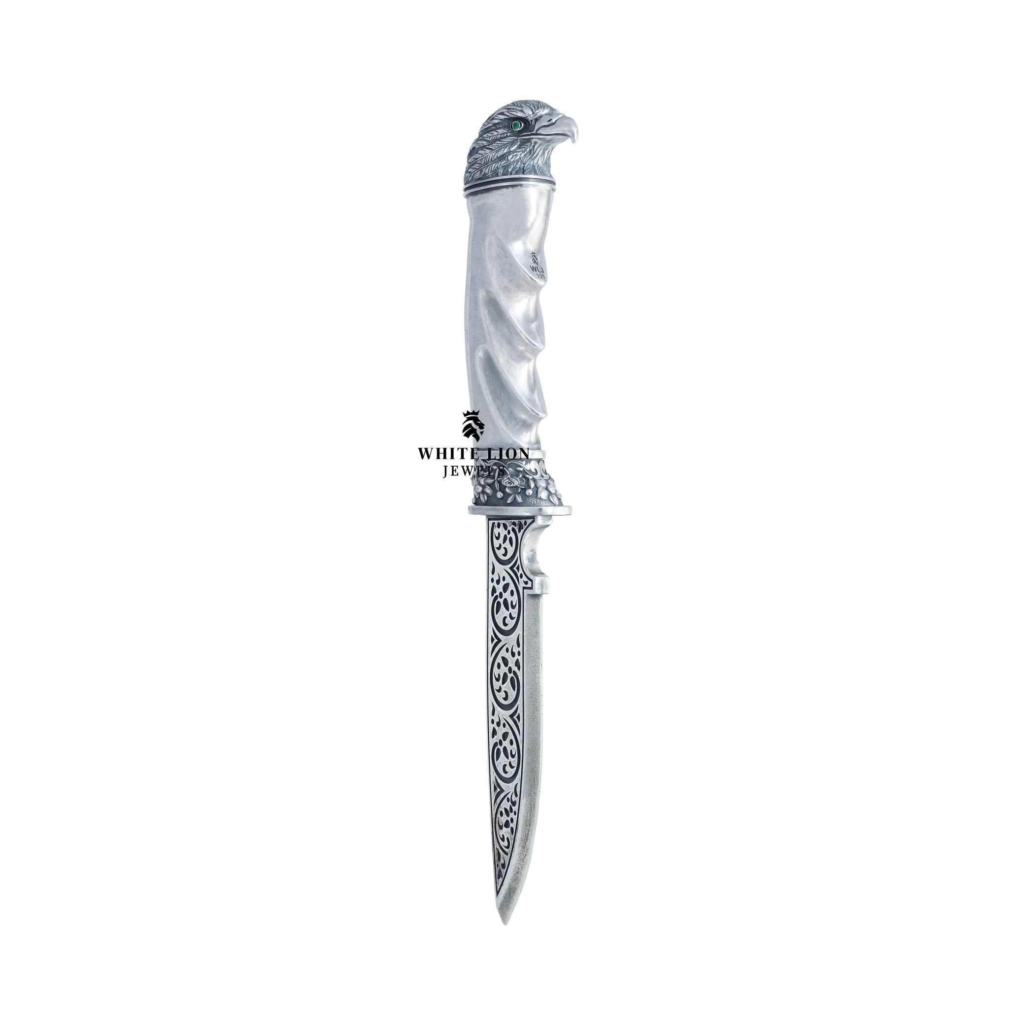 Discover elegance and artistry in the Eagle Katar 925 Sterling Silver Classic Royal Dagger by White Lion Jewels. This exquisite piece embodies strength and sophistication, designed for collectors and enthusiasts of fine jewelry. Its remarkable craftsmanship makes it a stunning addition to any collection.