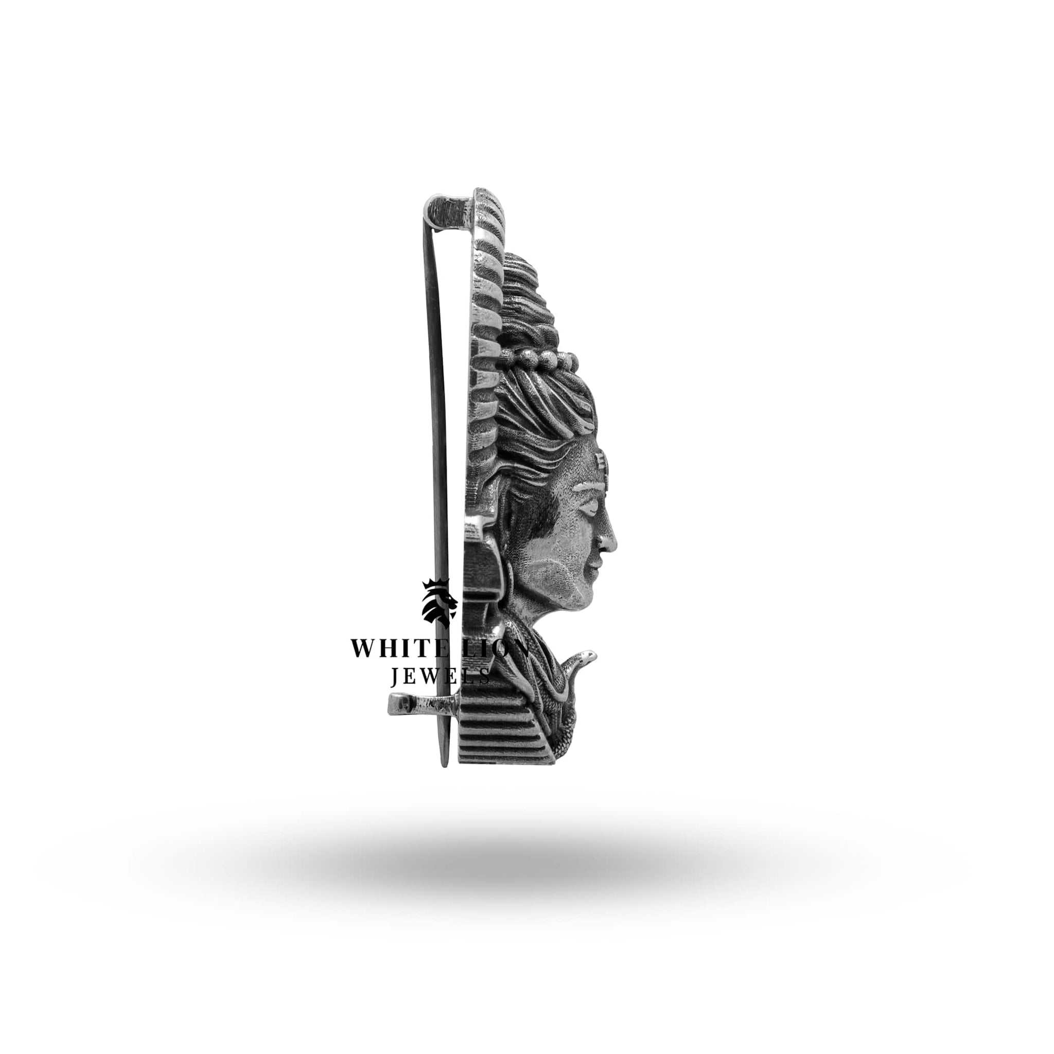 Handcrafted to perfection, the Lord Shiva Shankara Mahadev brooch pin showcases the intricate artistry characteristic of White Lion Jewels. Made from premium quality 925 sterling silver, the pin is adorned with oxidized silver that enhances its vintage appeal. The detailed etching and design reflect the divine essence of Lord Shiva, ensuring each piece is unique. With a weight of approximately 17.5 grams and a diameter of 4.0 cm, this brooch offers a perfect balance of sturdiness and elegance, embodying superior craftsmanship and exceptional attention to detail.