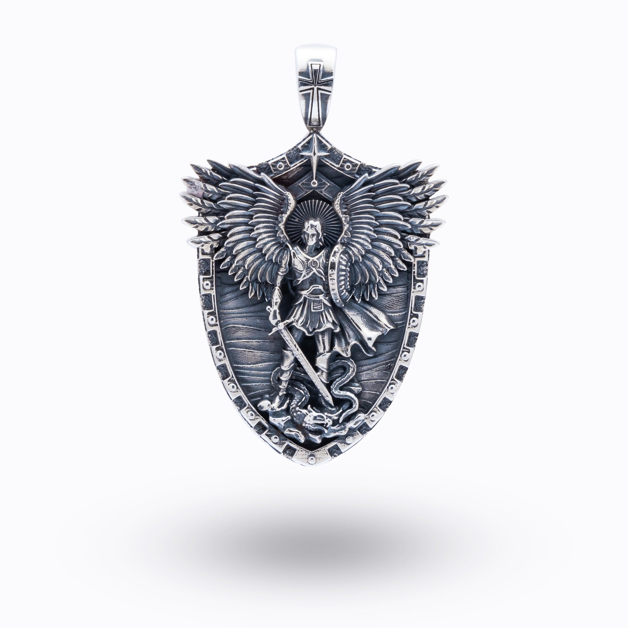 This pendant showcases a meticulous design and artisanal quality, featuring oxidized sterling silver that offers a dramatic flair. Crafted from high-purity 925 sterling silver, each detail has been thoughtfully executed, ensuring a piece that stands out for its intricate craftsmanship. The pendant's striking motif of St. Michael piercing the devil reflects a timeless battle between good and evil, making it not just a piece of jewelry, but a symbol of strength and protection.