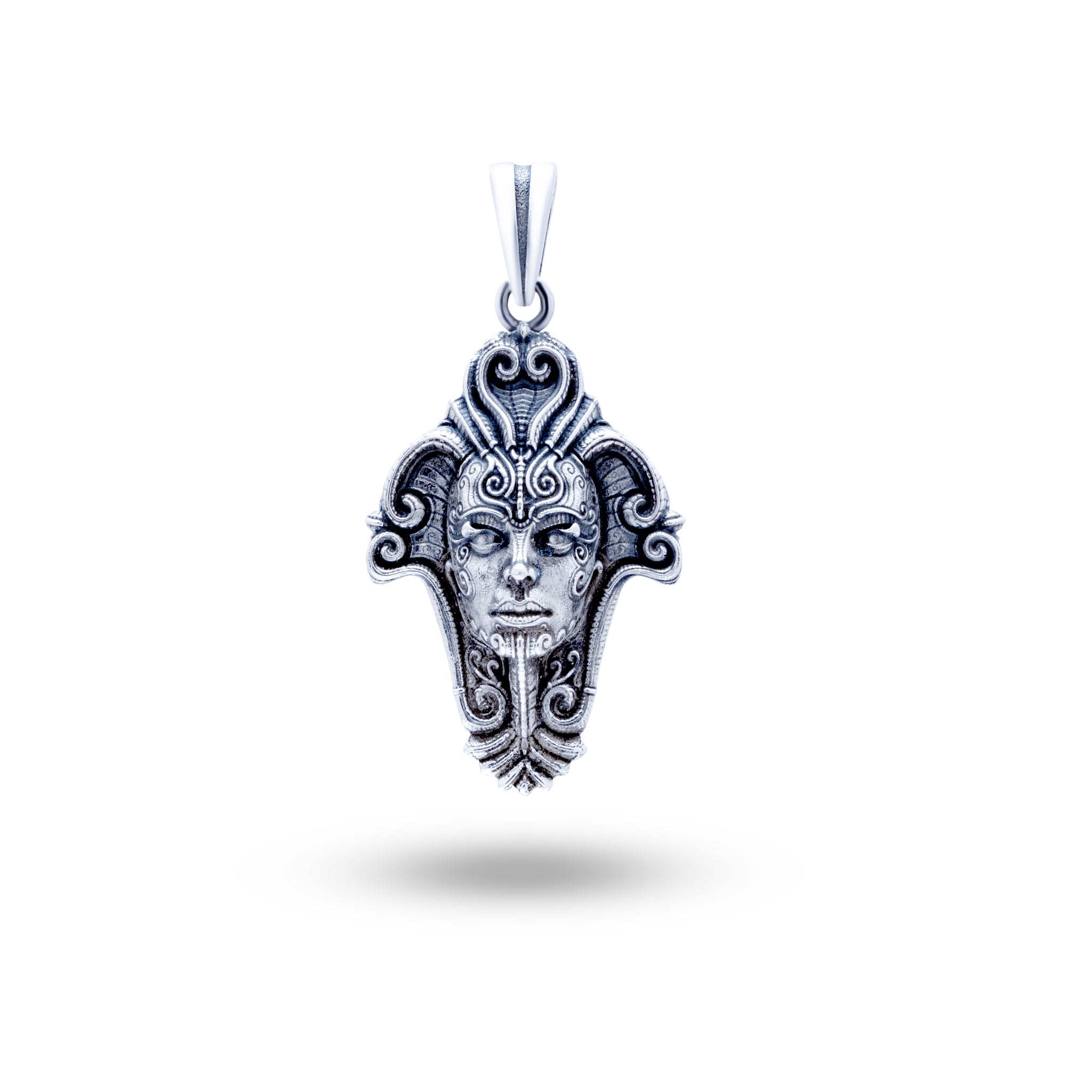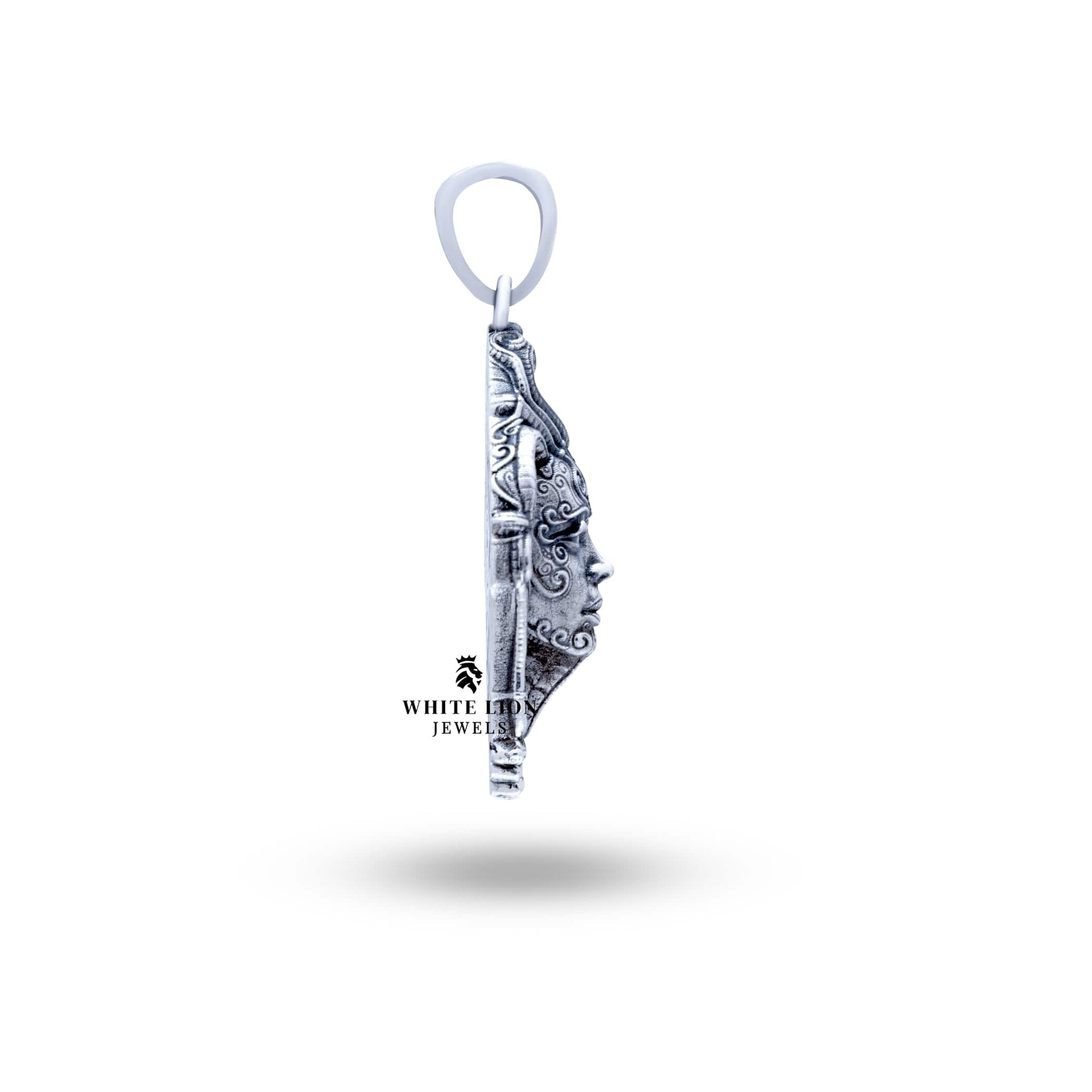 Meticulously crafted from high-quality 925 sterling silver, the Queen Mother Head pendant features a unique oxidized silver finish that adds depth and character to its refined design. Our skilled artisans pour decades of expertise into each creation, ensuring that every detail is perfectly executed. The pendant is also nickel-free and coated with a clear protective layer, guaranteeing longevity and a pristine appearance. With a diameter of 3.0 cm, this exquisite piece embodies both strength and grace, making it a true work of art.