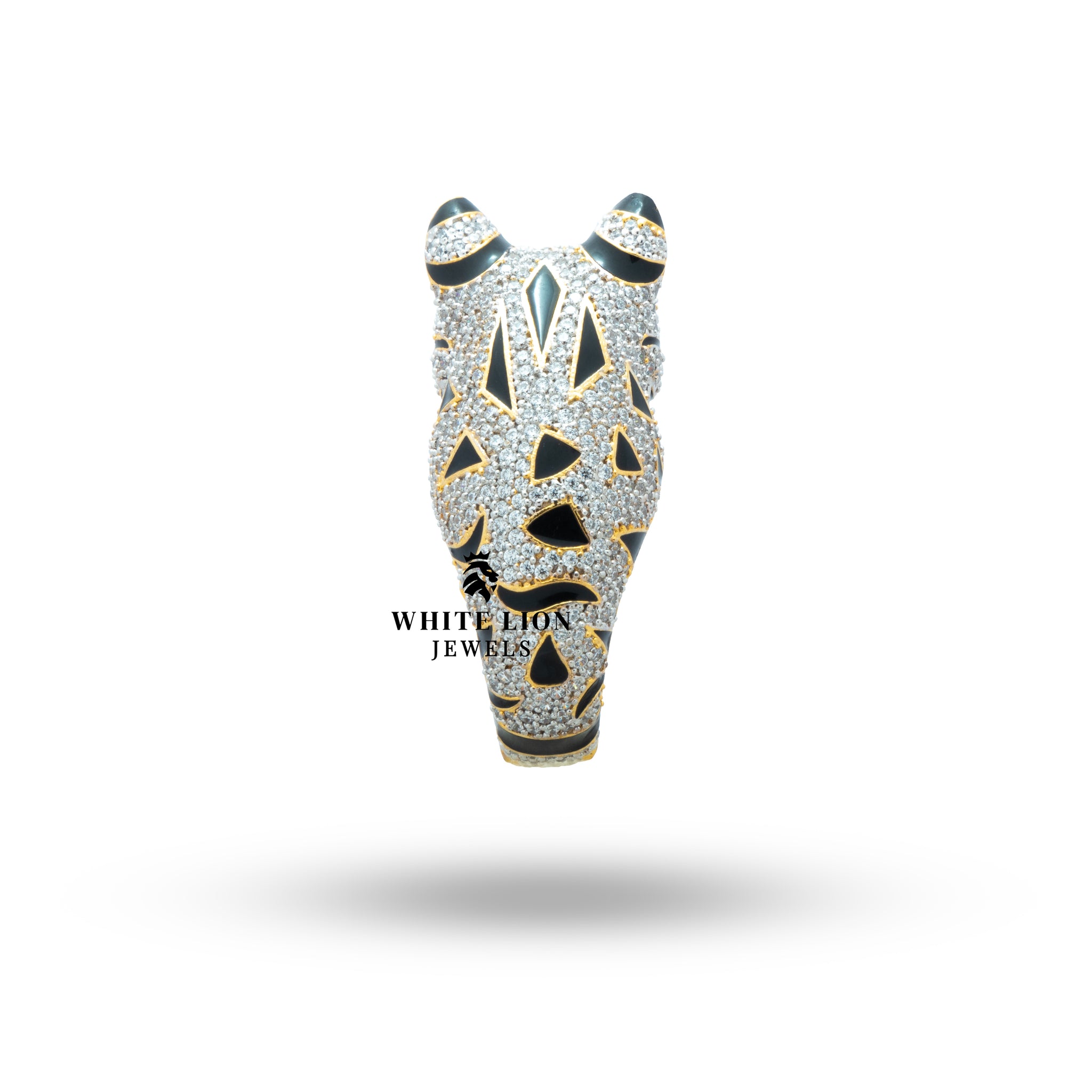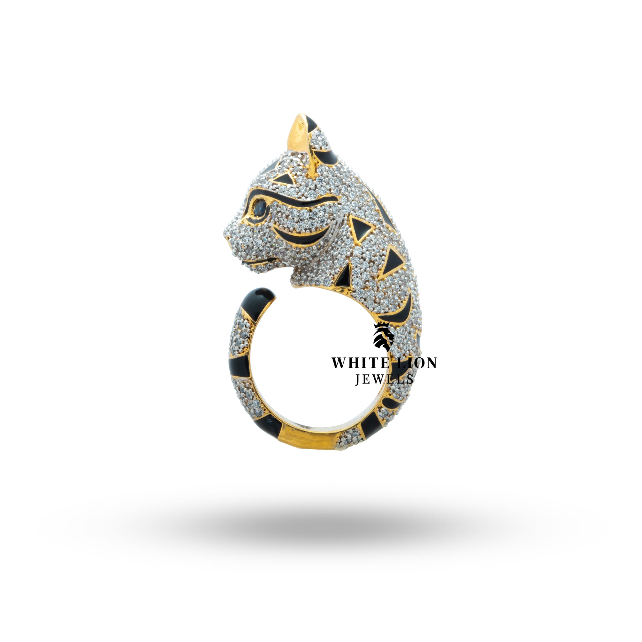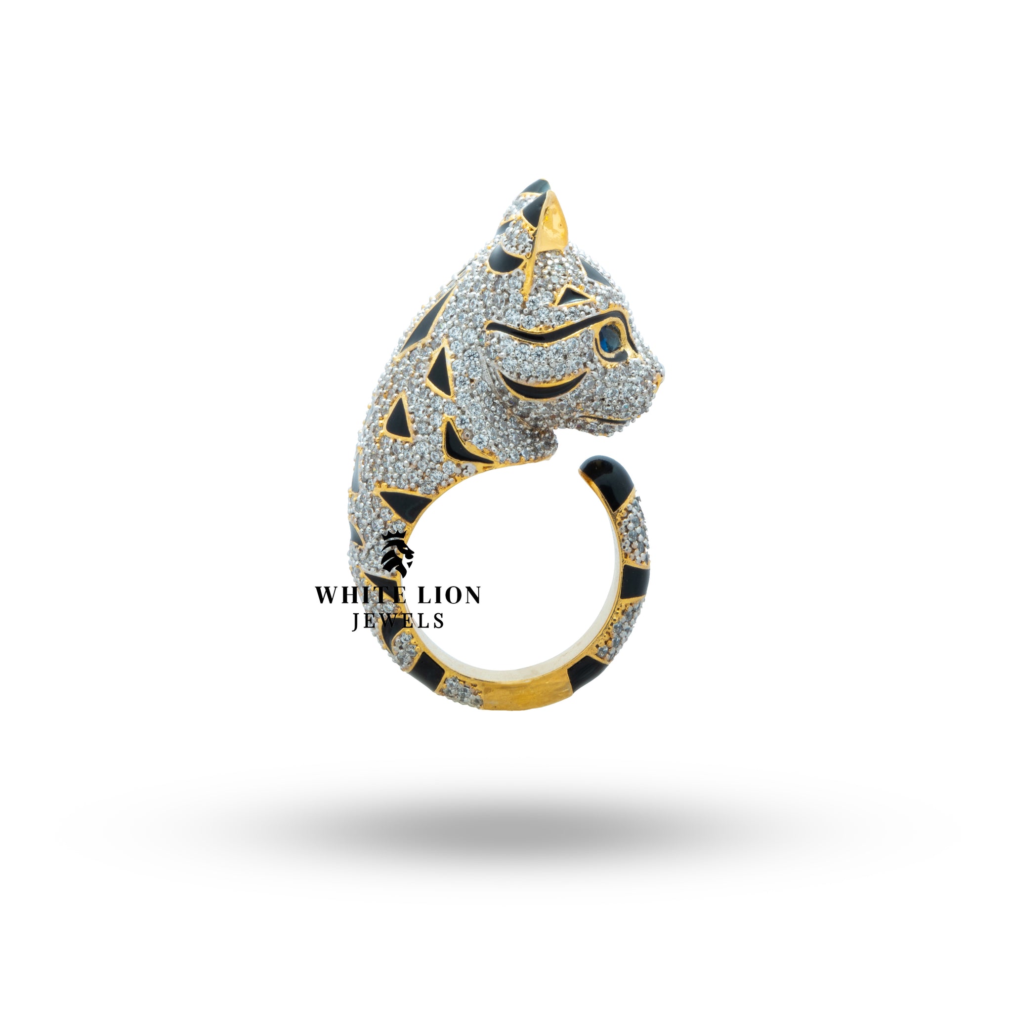 Introducing the exquisite Cat Cubic Zirconia Iced out 925 Sterling Silver Gold Plated Ring from White Lion Jewels (WLJ). This elegantly designed ring combines sophistication and charm, making it the perfect accessory for those who appreciate unique and luxurious jewelry. Tailored for fashion-forward individuals, this statement piece embodies both glamour and playfulness.